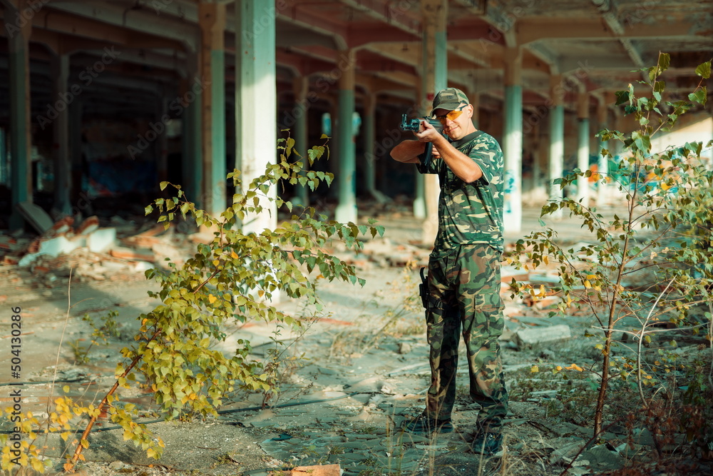 Airsoft hand in the hand industry building.