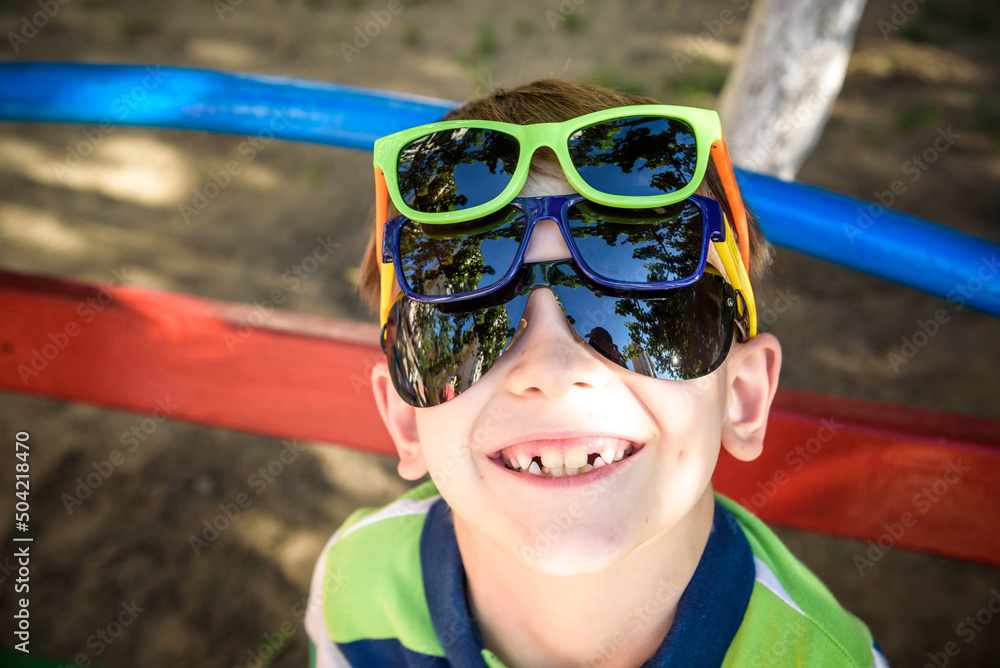 Portrait of a cheerful boy child in several sunglasses outdoors.