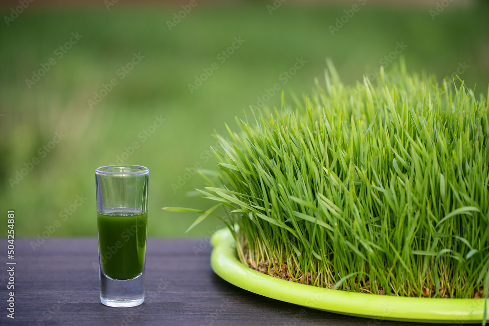 Healthy organic green detox juice from grass of green germinated wheat grains, close up