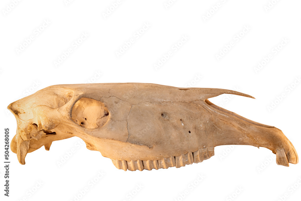 Horse equine (Equus caballus) mammal with natures teeth and skull anatomy on white background. Natures and biology of domestic animals.