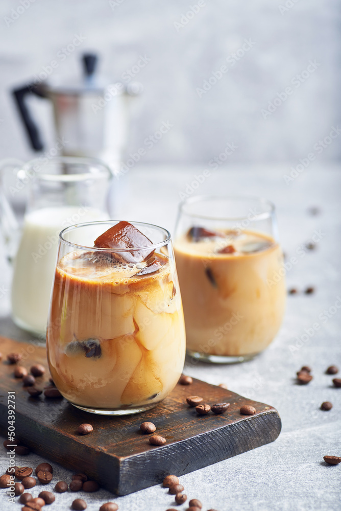 Ice coffee in glass. Ice coffee served in glass with coffee ice cubes and milk cream on table.