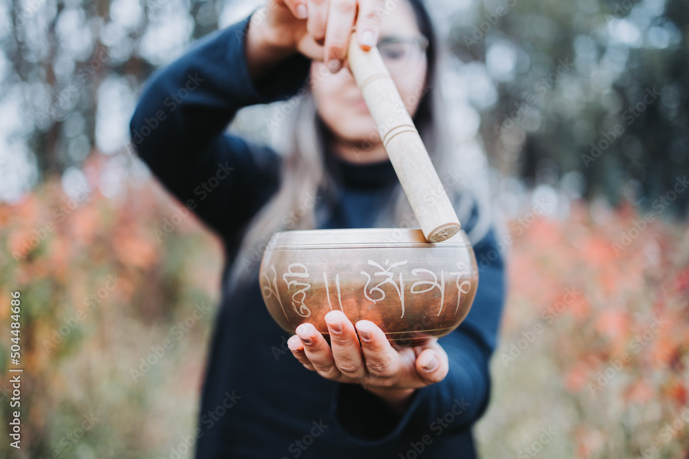 Black dressed buddhist woman holding and playing a tibetan singing bowl with a wooden stock. Selective focus