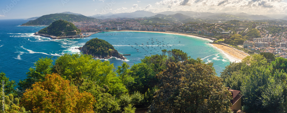 Aerial panoramic view of San Sebastian or Donostia with beach La Concha in a beautiful summer day, Basque country