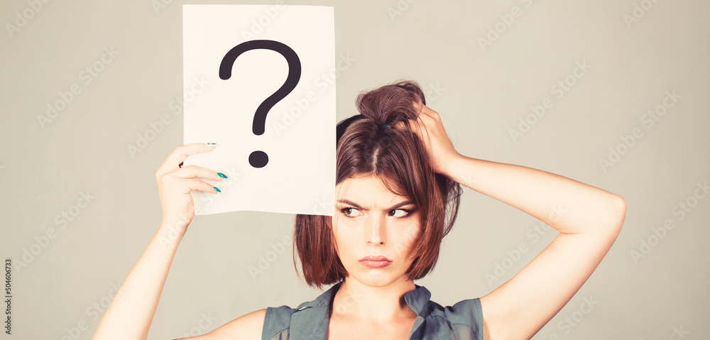 Thinking woman. Concept - challenging issue, looking for the answer. Isolated girl. Woman with doubtful expression and question marks. Question mark, symbol. Girl question. Getting answers, thinking.