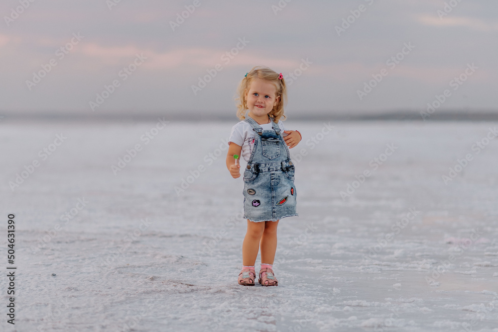 Little girl meets sunset on firth kuyalnik when it's coast is white because of the salt