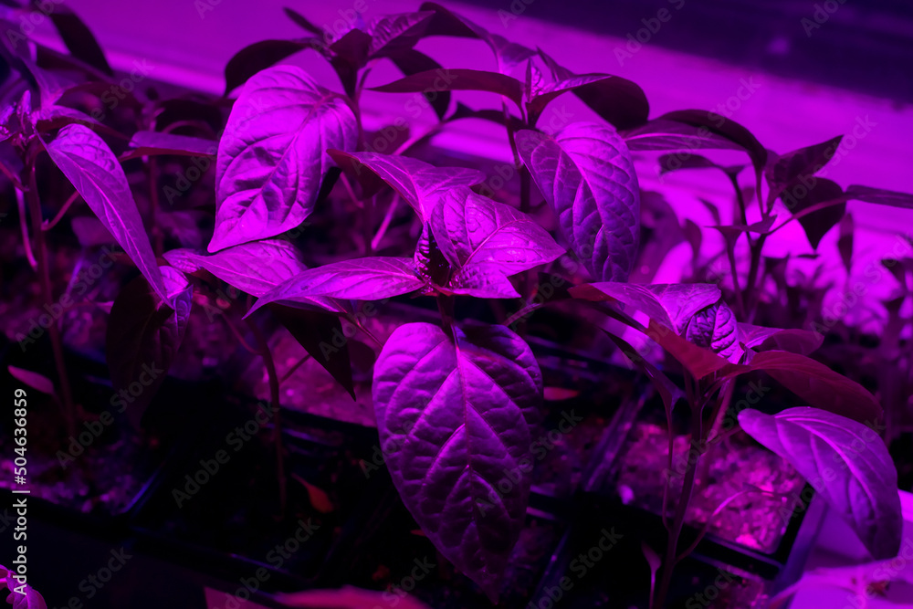 Full spectrum growing lamp with ultraviolet UV LED plant lights for cultivation eco vegetables. Bell pepper young plants under rays of LED grow lights