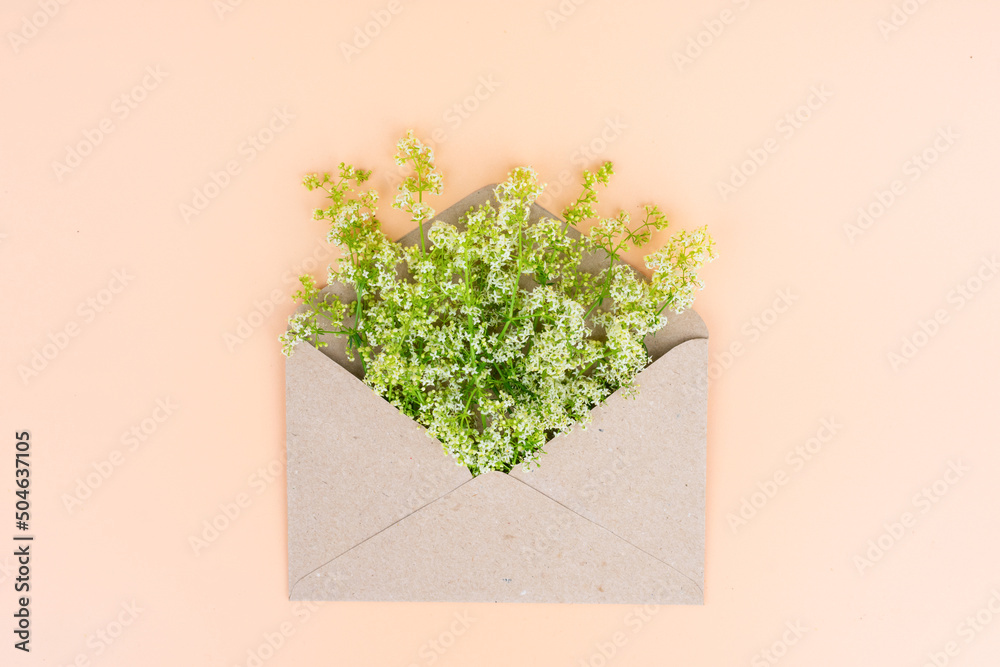 Floral background with opened paper envelope with lots of blooming tiny white flowers in the middle of beige background.Concept of spring coming, holidays, good news and love emotion