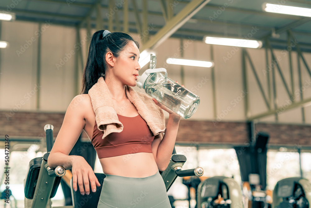 Fitness woman resting from excersise in the gym and drinking water from bottle.