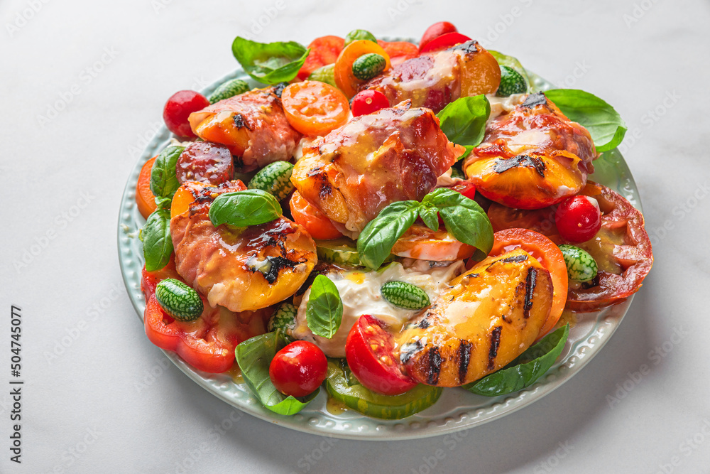 Delicious summer salad with grilled peaches, tomatoes, prosciutto and cheese in a plate on white table. Close up