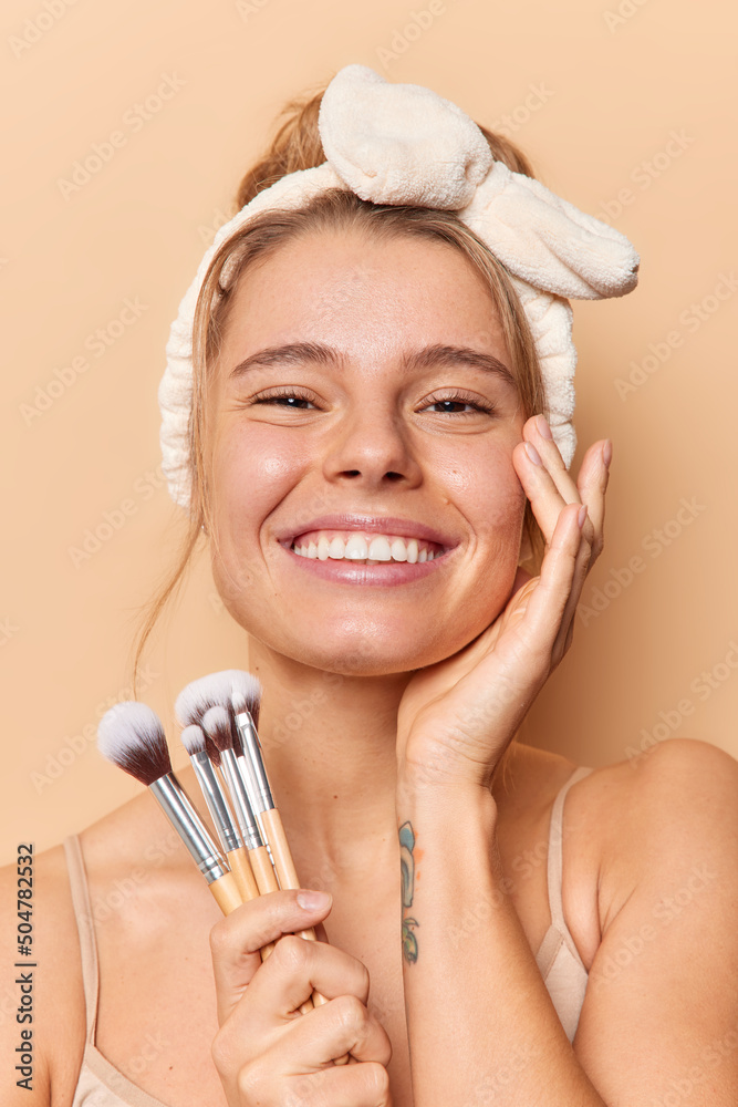 Vertical shot of cheerful European woman touches face gently smiles toothily holds cosmetic brushes has natural beauty smooth healthy clean skin wears headband isolated over beige background.