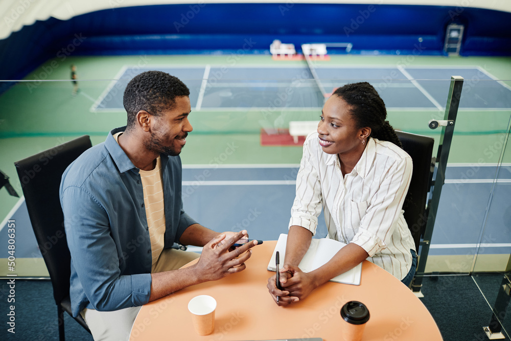 High angle portrait of smiling black sportsman talking to female coach during after practice meeting at training center