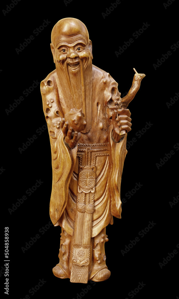 Wood statue of japan lucky god, God of prolonging life longevity Fukurokuju isolated on black background