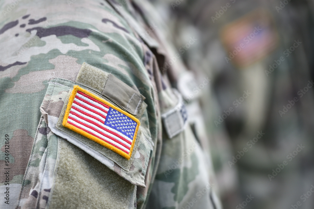 Detail shot with american flag on soldier uniform standing in military position during ceremony