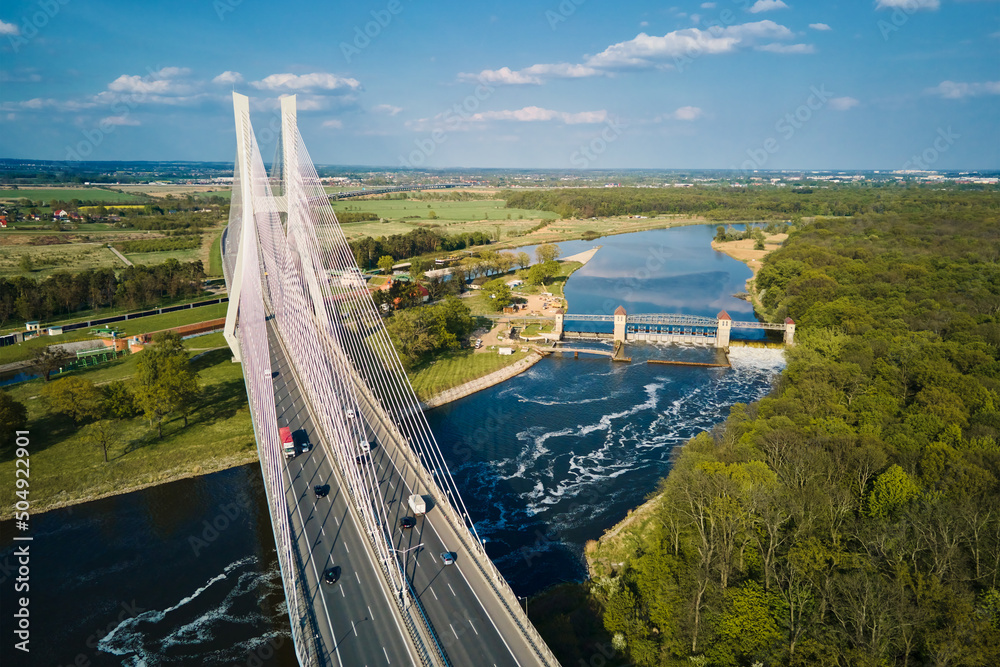 Large modern bridge over river in europe city with car traffic, aerial view. Redzinski bridge over Oder in Wroclaw, Poland