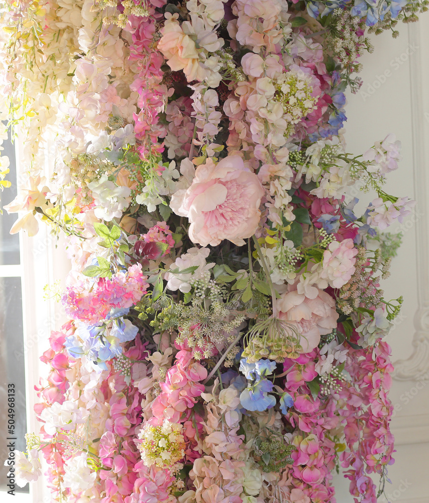 violet lilac, hydrangea, peony flower composition background on the wall close up photo