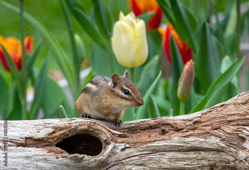 Small rodent chipmunk climbing over a log in a garden of spring tulips