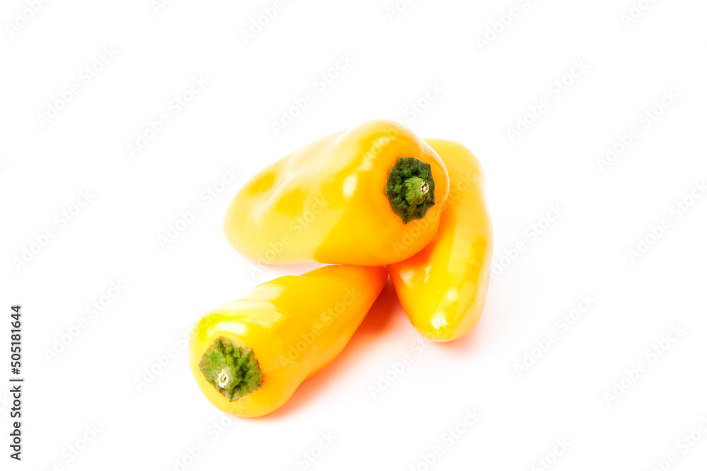 Three small yellow peppers on a white background. Vegan and vegetarian food