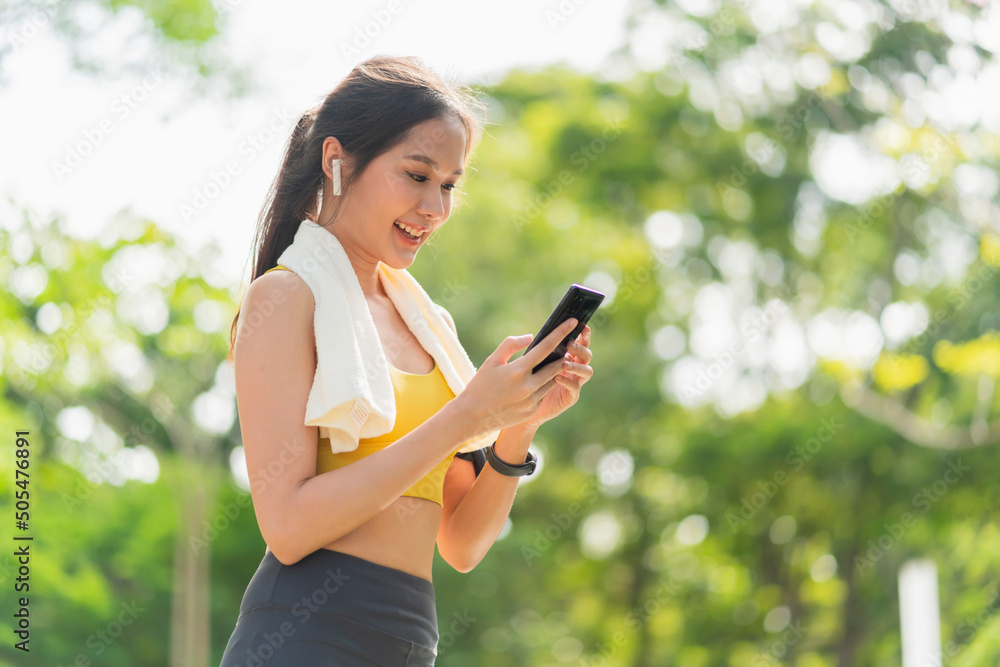 sport active asian female sport cloth setting up smartphone playing prepare for her running routine workout morning healthy lifestyle,smiling sport woman setting runing route in her application map
