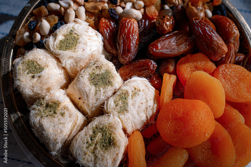 Dried fruits mix and nuts close-up. Arabian sweets.
