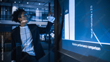e-Business Technology Conference Presentation: Innovative Black Businesswoman Talks about Revolutionary High-Tech Product. Projector Screen Shows Graphs, Infographics, AI, Big Data, Machine Learning