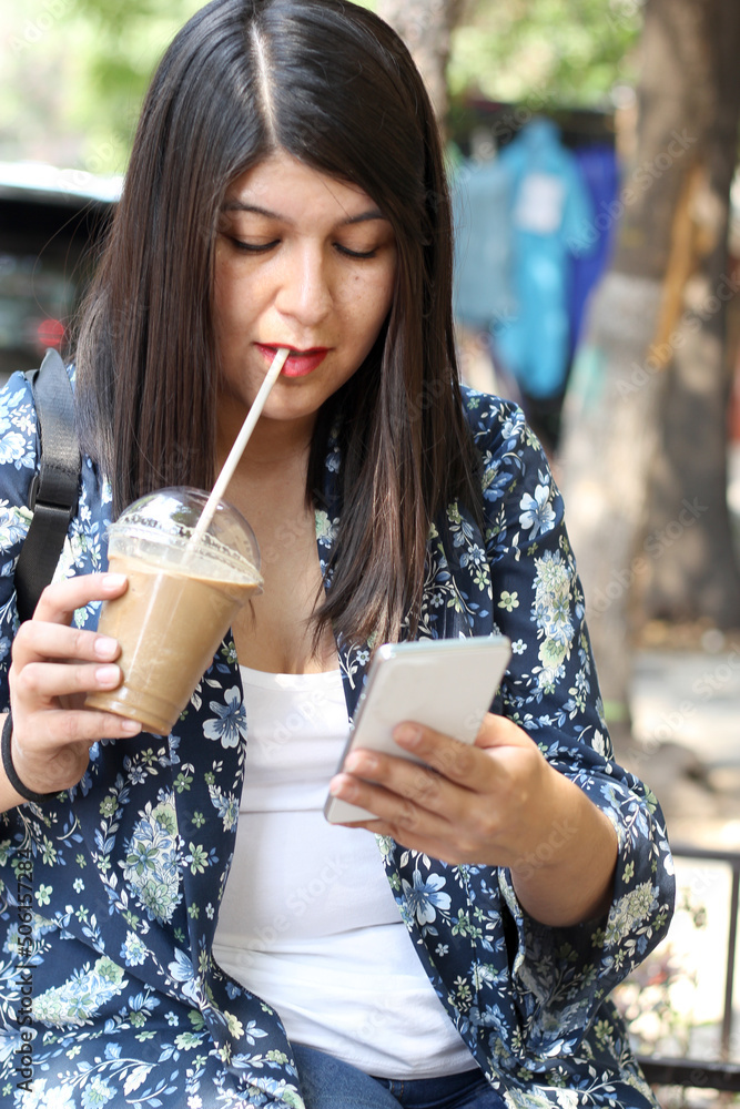 Latin adult woman drinks a cold coffee with a straw outdoors alone, uses her cell phone to send messages and receive calls, she is happy single, empowered