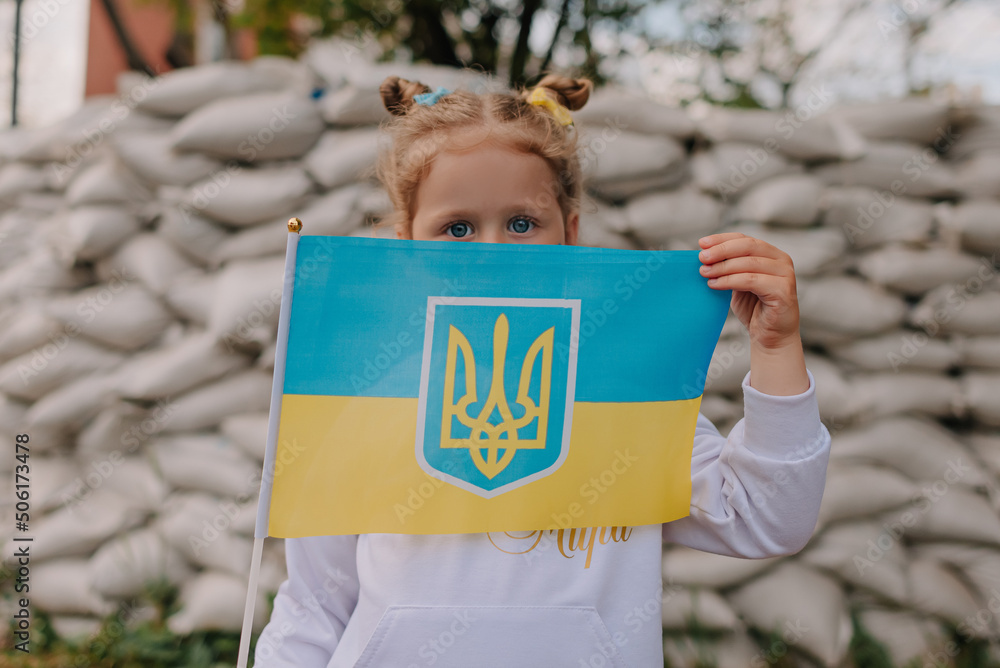 Ukrainian girl with Ukrainian flag in her hand and ukrainian flag painting on her face in front of military barrier