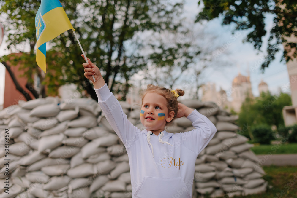 Ukrainian girl wave Ukrainian flag in her hand and ukrainian flag painting on her face in front of military barrier