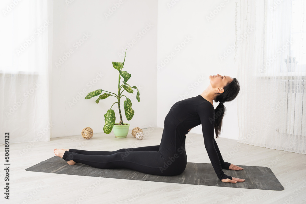 A woman in black sportswear does yoga, performs a backward deflection, trains in a room sitting on a mat