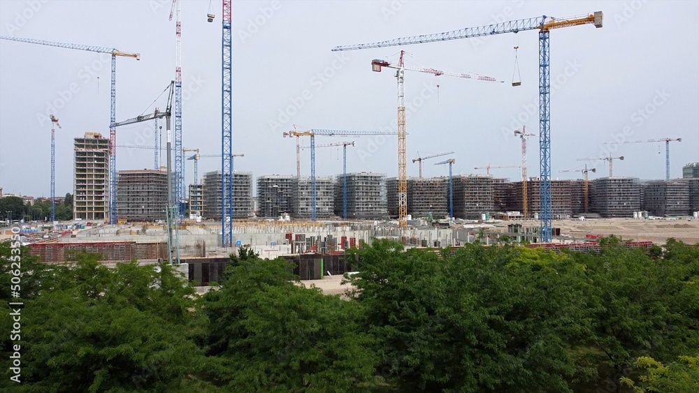 Drone view of Sei Milano, new GARDEN CITY in the western suburbs near Bisceglie subway. Urban regeneration project and green revolution - building site and gru for the new skyline and skyscrapers