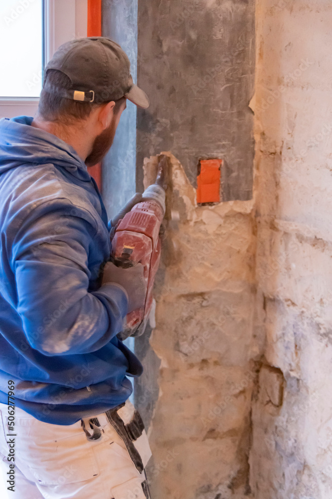 Ouvrier sur chantier enlevant le plâtre d'un mur avec un marteau-piqueur