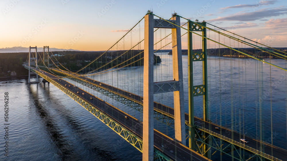 Aerial view of the Narrows bridge in Tacoma Washington during the sunset