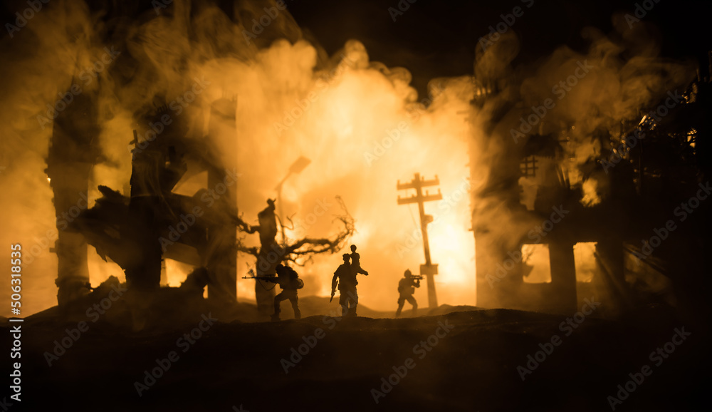 Silhouette soldier carrying little boy on his shoulder from fire. Rescue savior concept. Man moving out with little boy from burned out city destroyed in war. Selective focus