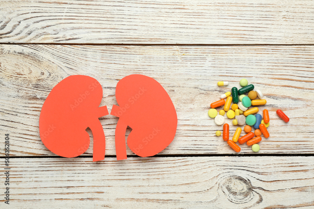 Paper cutout of kidneys and pills on white wooden table, flat lay