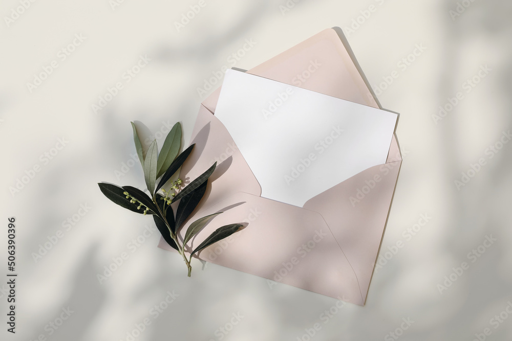Summer Mediaterranean wedding stationery still life. Blank greeting card, imvitation mockup. Blush pink envelope in sunlight, beige table background in sunlight. Green olive tree branches. Flat lay