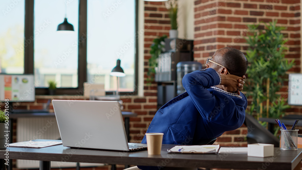 Company assistant relaxing on work timeout in startup office, relieving stress for peace of mind. Sitting with hands behind head, laid back on chair enjoying break pause at desk.