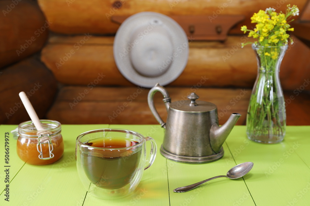On a green wooden table is a mug of black tea near jar of honey and vase with field flowers on the background of log wall with white hat hanging on it.