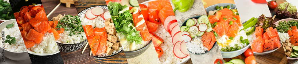 Set of pokee bowls with boiled rice, marinated salmon and fresh vegetables, closeup