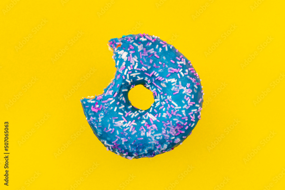 Bitten blue glazed donut with colorful sprinkles