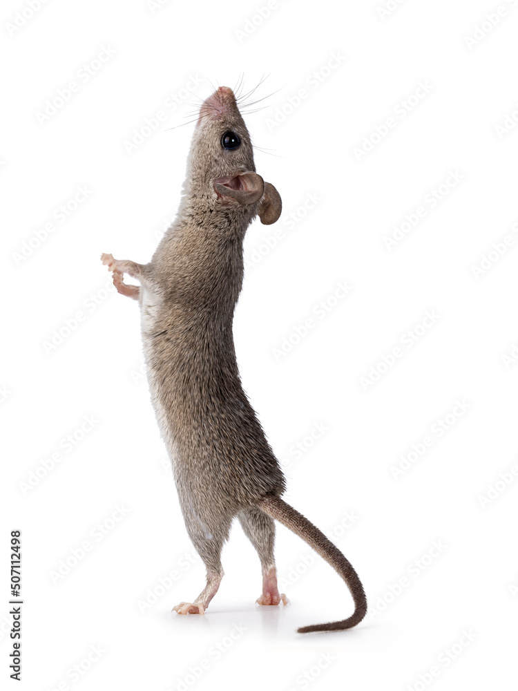 Cute Cairo spiny mouse aka acomys cahirinus, standing up on hind paws. Isolated on a white background.