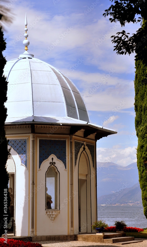 A girl in a jacket trains a guard dog of the Rottweiler breed against the backdrop of a lake and sunset