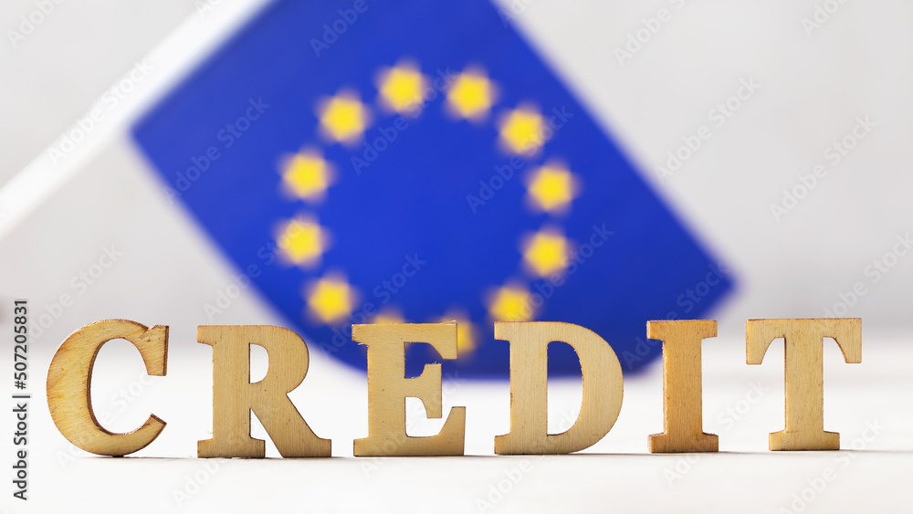Wood lettering text and EU flag on abstract background, loan concept from European Union