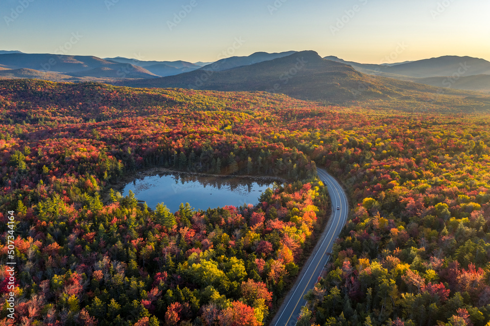 A road, highway through a forest with trees in fall colors of red, orange and yellow, lake, mountains, Kancamagus Highway, White Mountains, New Hampshire.