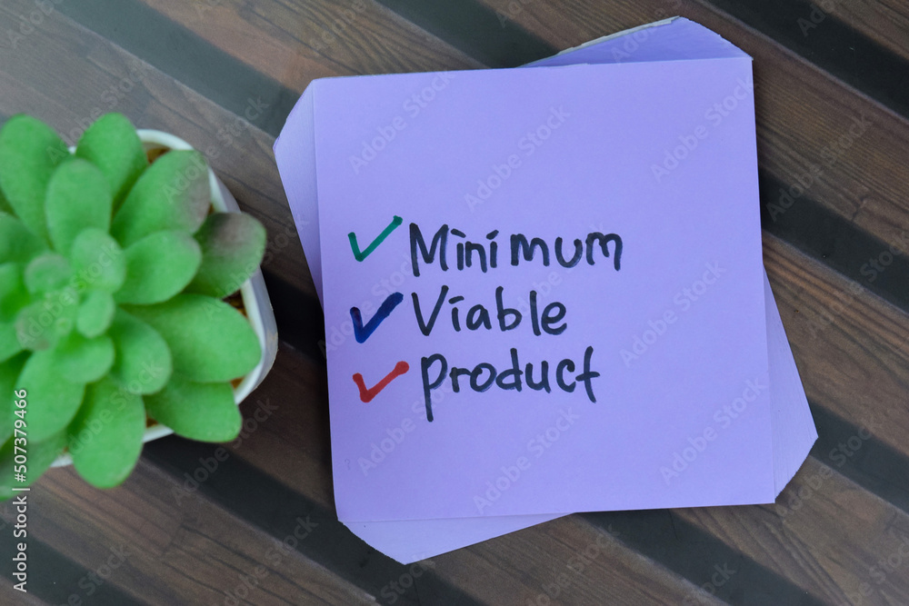 Concept of Minimum Viable Product write on sticky notes isolated on Wooden Table.