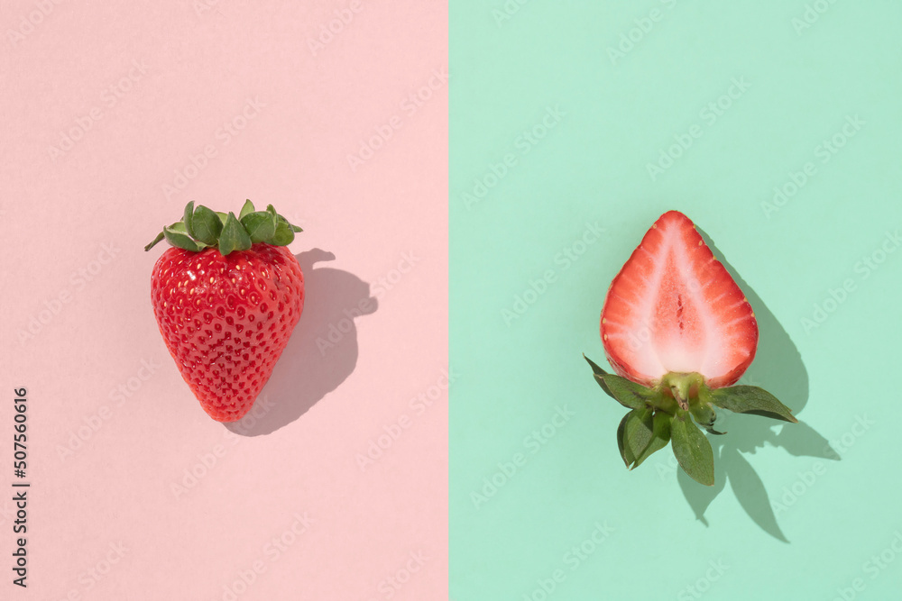 One whole and one sliced strawberry on a pastel pink and tiffany green background with sharp shadows. Minimum summer concept