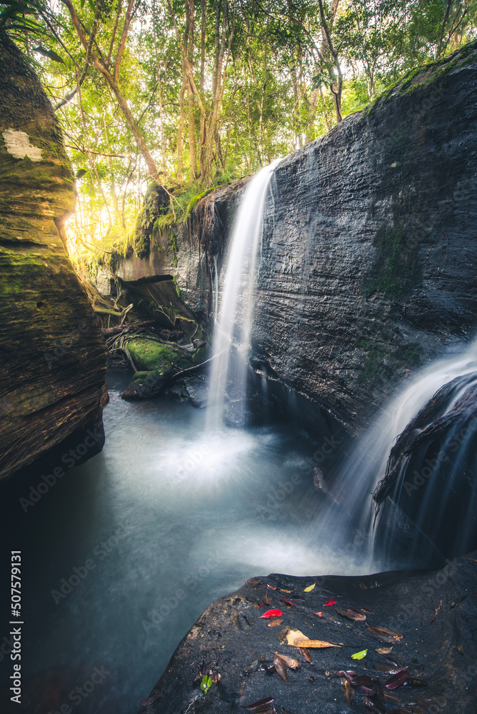 Scenic view of a cool refreshing waterfall hidden in a mysterious forest with sunlight shining through lush greenery. Beautiful waterfall rainforest in Phukradueng, Loei province, Thailand.