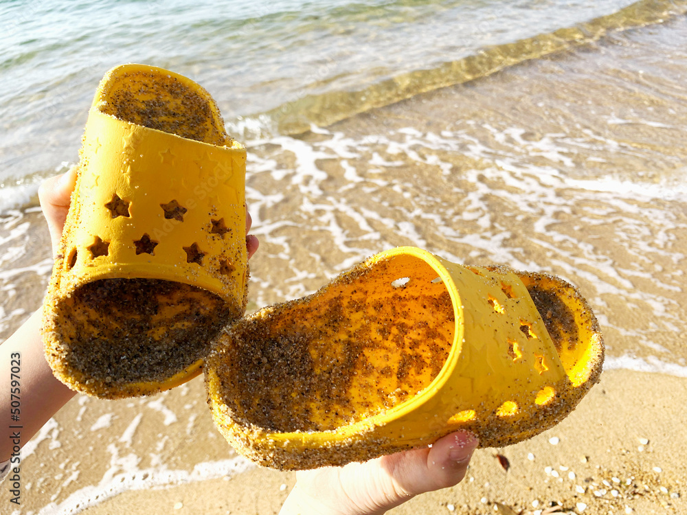 砂浜でビーチサンダルを手に持つ子供、ビーチで遊ぶ
