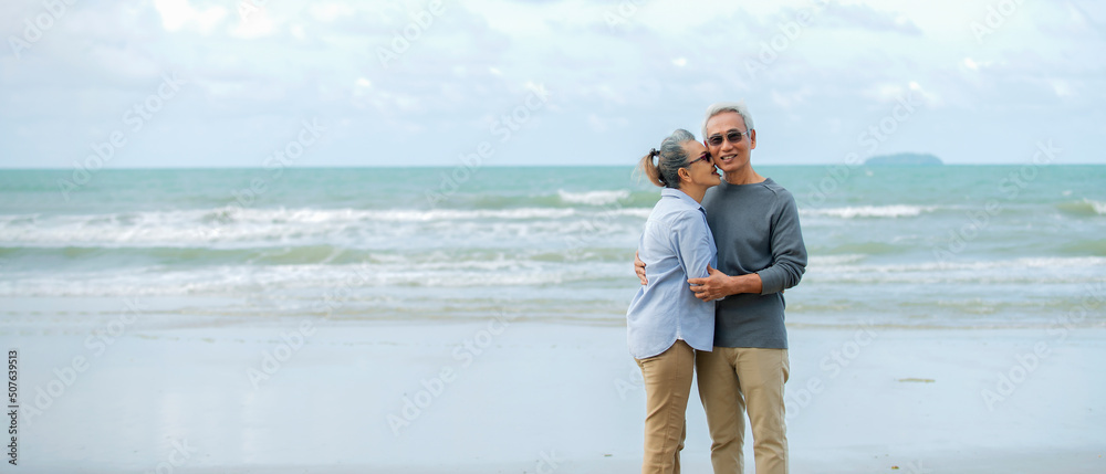 Asian Senior couple walking on the beach enjoy life at sunrise