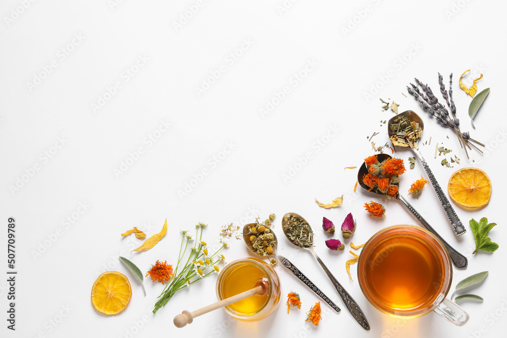 Freshly brewed tea and dried herbs on white background, top view. Space for text