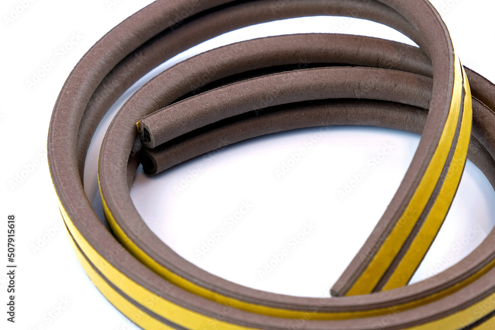 Brown seal universal self-adhesive for doors and windows. Self adhesive yellow rubber sealing roll. Foam insulation for windows and doors. Selfadhesive seal on the door on a white background