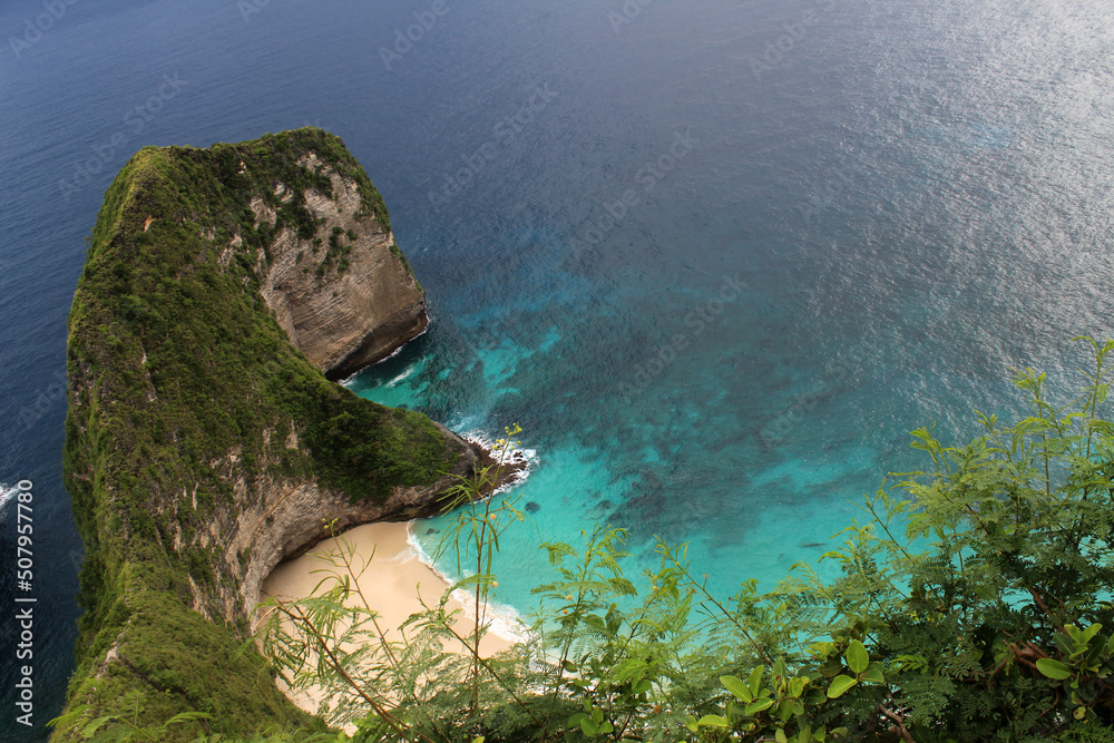 High angle view of Kelingking beach with unique shape of rock formation, blue and turquoise colors background of the sea water with white sands and surrounded by green plant. Nusa Penida Island, Bali